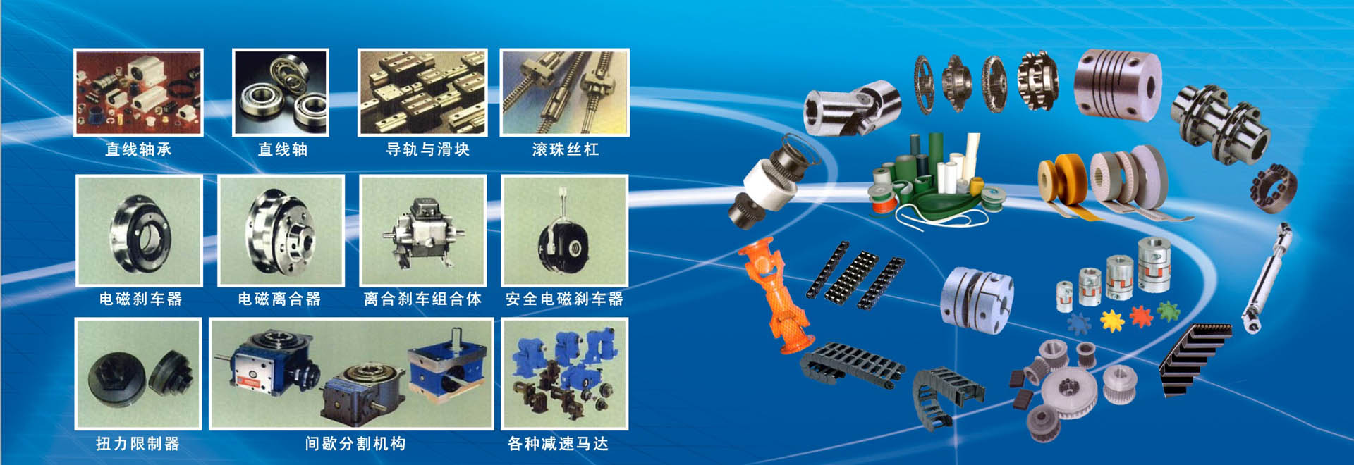 產品有:一、PVC、PU、PE、橡膠等材質的輸送皮帶、鋼板助卷帶、尼龍片基帶、印花導帶、瓦楞紙棉織輸送帶、導條輸送帶、各種花紋輸送帶、沖孔輸送帶、裙邊輸送帶、檔板輸送帶、特氟龍耐高溫輸送帶、金屬網輸送帶。二、德國、美國、日本、意大利等品牌三角帶、同步帶、高速防油帶、變速帶、廣角帶、多楔帶、圓帶、六角帶、活絡帶。三、同步帶輪、三角帶輪及錐套。主要有鋁合金和45#鋼等材質 四、金屬制國標、非標滾子鏈條、鏈輪、鏈板、工程塑料拖鏈、鋼制拖鏈。五、聯軸器、脹套。